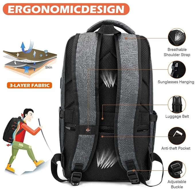 Comfort is engineered into every detail. The ergonomic “S”-shaped shoulder straps, combined with thick back and shoulder cushioning, distribute weight evenly across your upper body, reducing strain during long hours of wear. Despite its large capacity, the backpack remains lightweight at just 450 grams.
