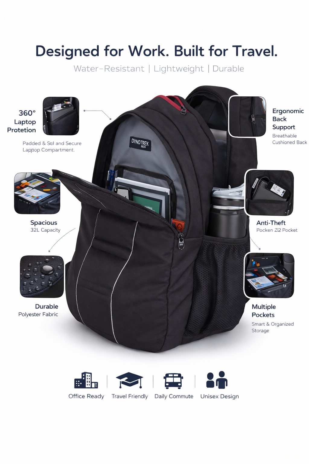 The Dynotrek Troodon Travel Laptop Backpack is designed for professionals, students, and travelers who need reliable storage with superior comfort. Featuring a 40L capacity, this waterproof backpack securely fits laptops up to 17.3 inches while offering multiple compartments for organized storage. Its breathable padded back panel and adjustable shoulder straps ensure all-day comfort, even during long commutes or travel. Lightweight, airline approved, and built from durable eco-friendly materials, it is ideal for office, college, business trips, and everyday use.